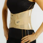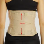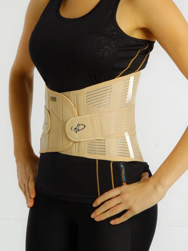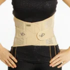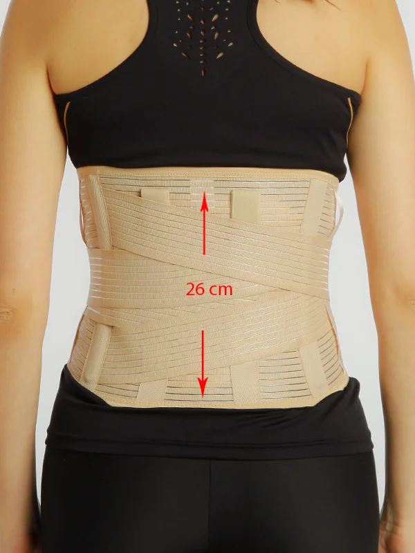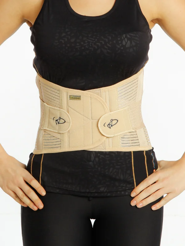 Place the plastic/steel underwires in the lumbar region to include the lumbar and sacral discs of the vertebrae and connect the Velcro straps in front on the abdomen.