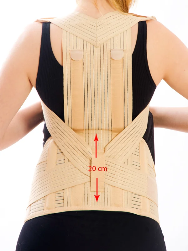 Place the wide body of the product on your back and fix it with elastic bands, fix the corset section under your belly to give support.