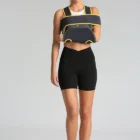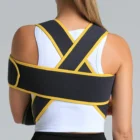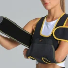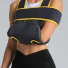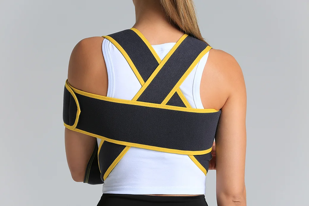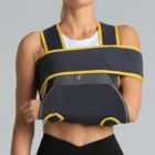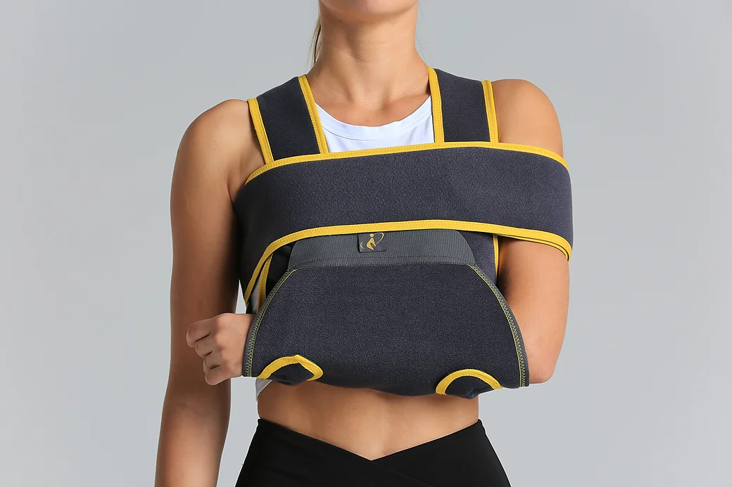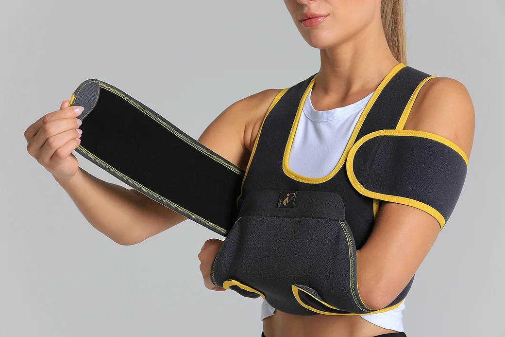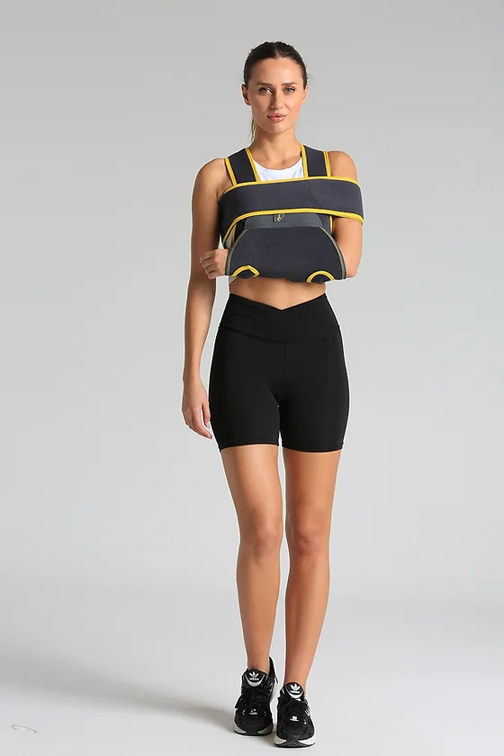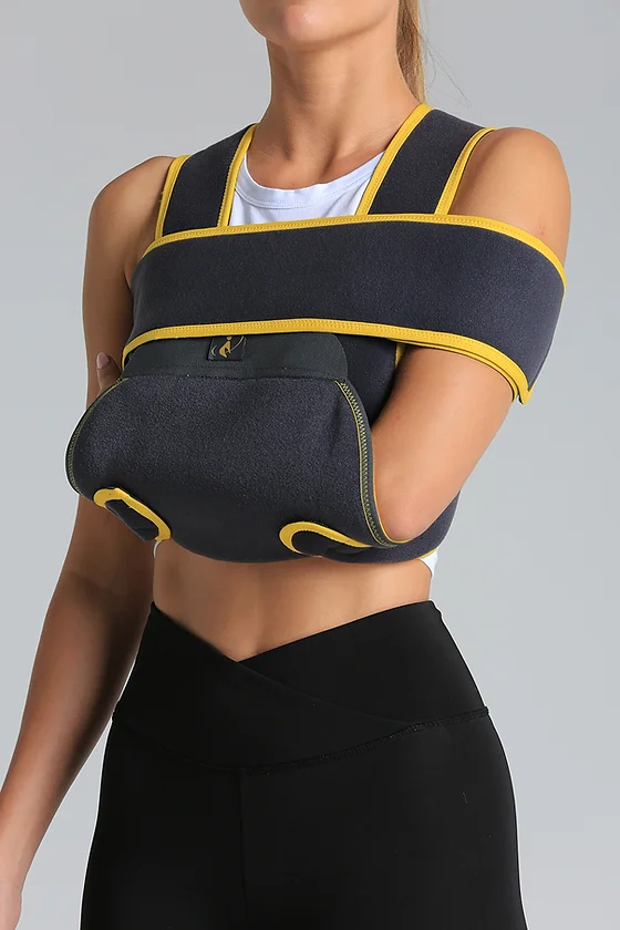 Place your arm on the large towel surface and fasten the Velcro straps. Then pass the long bandages over the shoulder, cross them on the back, and fix them under the forearm.